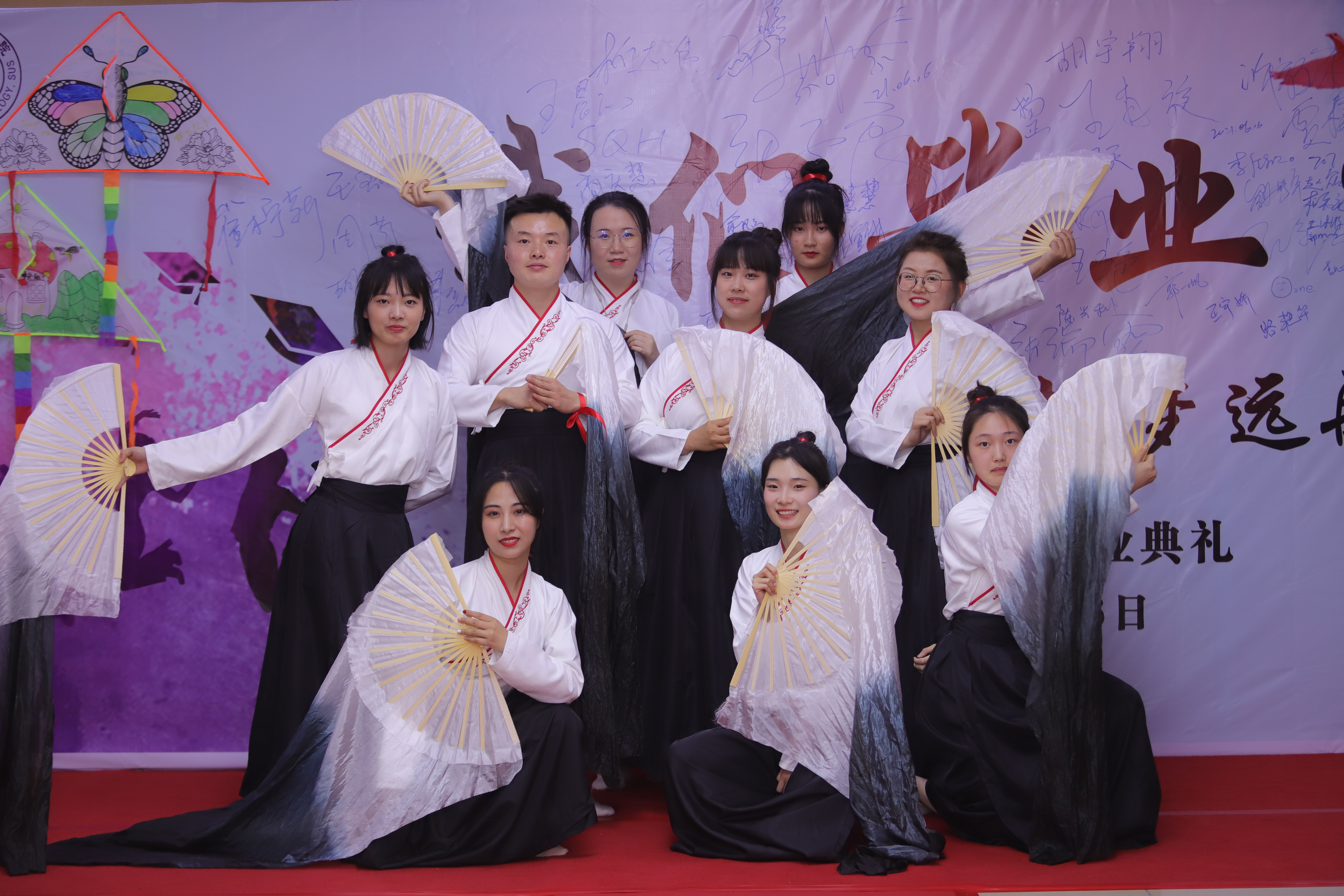 每位同学都盛装出席,以风采各异的衣着和造型,表达着对多彩青春的纪念、对老员工活的怀缅、对师生情谊的不舍。有的同学穿上了即将在毕业典礼上参加表演的演出服,拍起了花絮照;有退伍的同学穿上了昔日的戎装;还有身着礼服、西装、学士服的同学,拍起了不同风格的毕业照。背景墙正对面,由院员工会宣传部的同学搭起了摄影设备,用相机记录下了每一个珍贵的画面。