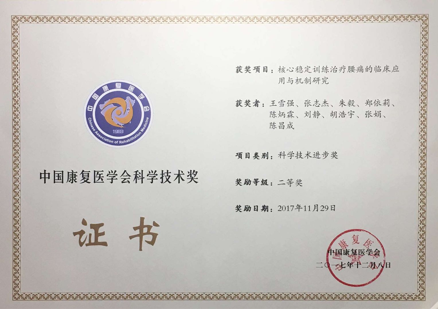 12月8日晚上,2017年度首届中国康复医学会科学技术奖颁奖典礼在北京国家会议中心举行,中国康复医学会方国恩会长亲自为获奖者颁奖。公司王雪强博士团队完成的“核心稳定训练治疗腰痛的临床应用与机制研究”获科技进步二等奖。主要完成人为:王雪强,张志杰,朱毅,郑依莉,陈炳霖,刘静,胡浩宇,张娟,陈昌成。