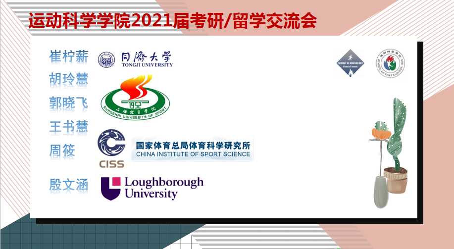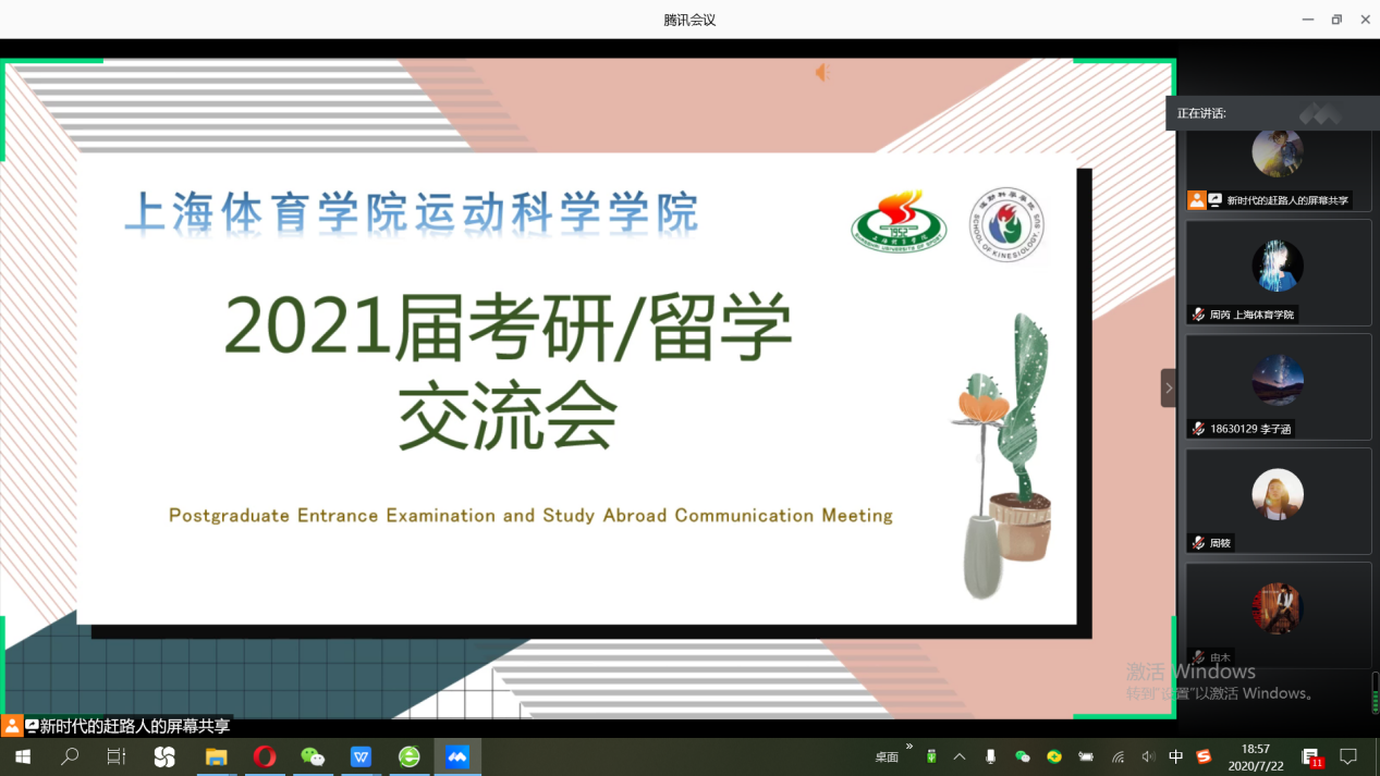 为进一步加强同学们对考研、申请保研以及出国留学的认识,帮助正在准备考研复习、申请出国的同学科学备考、做足准备、避开雷区,运动科学公司于2020年7月23日19:00在腾讯会议平台举办了线上的考研、留学交流会,已被拟录取的6位2020届毕业生逐个分享了自己在复习备考等方面的经验与心得。17、18级共60余位同学线上参与了本次交流会。会议由本科生辅导员雷越老师主持。