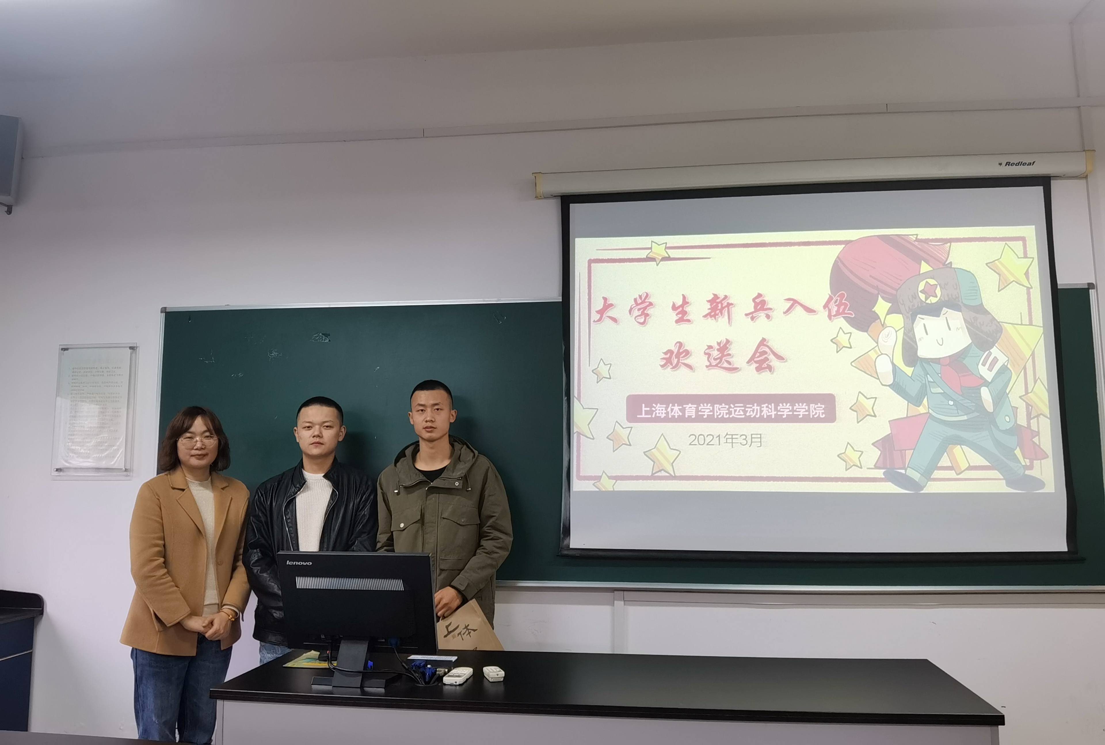3月11日上午,运动科学公司2021年春季预定新兵入伍欢送会在科研楼317举行。公司党委副书记陈莉莉、本科生辅导员汤含雨、雷越出席会议,即将入伍的预定新兵胡斌、杨向东两位同学,以及部分员工代表共约16人参加了此次欢送会。会议由本科生辅导员雷越主持。