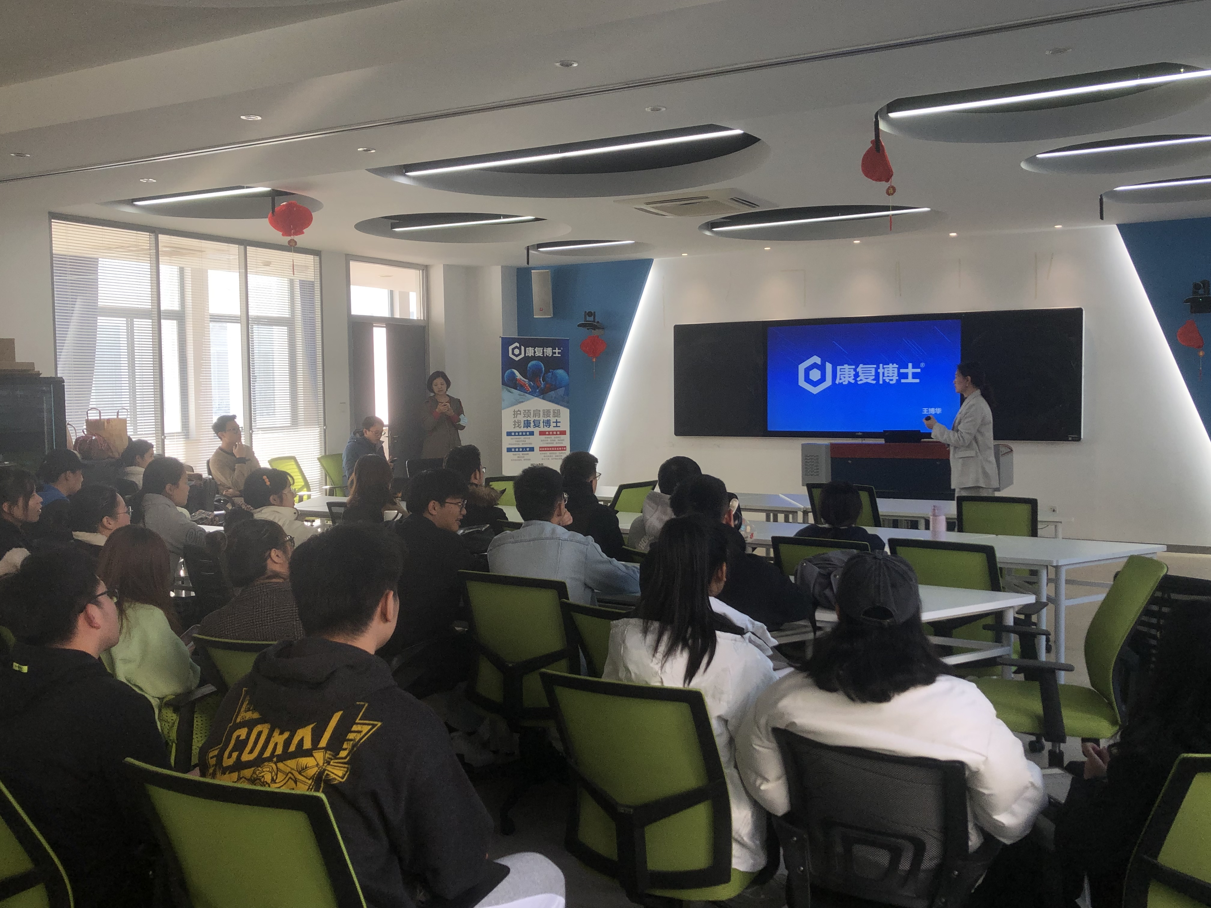 紧接着,康博士(上海)运动康复中心南方店店长李泽中从人才需求的角度,介绍了门店的具体岗位以及相应的工作职责。他还详细地阐释了企业关于人才培养的具体方案,包括对业务能力的培训、职业晋升路径的空间、优秀员工的典型案例等,让参会员工进一步了解了康复师职业成长的路径。