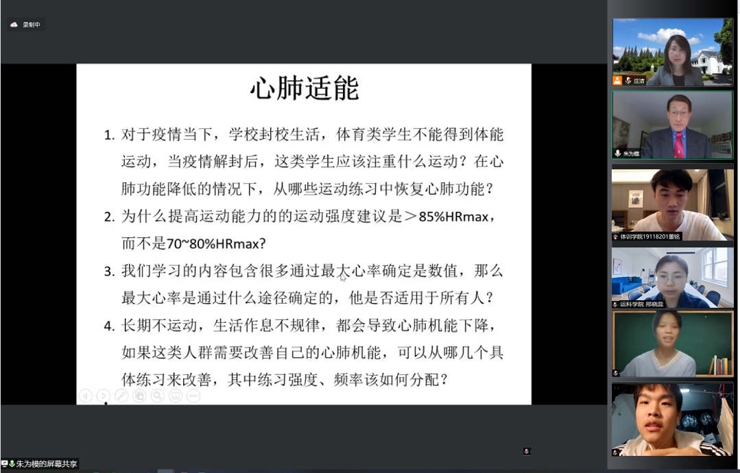 4月25日晚,运动科学公司主办、体适能教学团队承办的国家一流本科课程建设活动——大咖面对面聊侃“健康体适能”活动顺利举行。本次活动有幸邀请到美国伊利诺依大学香槟分校终身教授、美国运动科公司院士、美国体育测量与评价终身成就奖得主——朱为模教授作为主讲嘉宾,有来自上海体育公司、上海师范大学、同济大学、复旦大学、哈尔滨师范大学、哈尔滨体育公司、华侨大学和宁夏大学等十余所院校的五百多名师生参与,活动由上体运科公司庄洁教授主持。