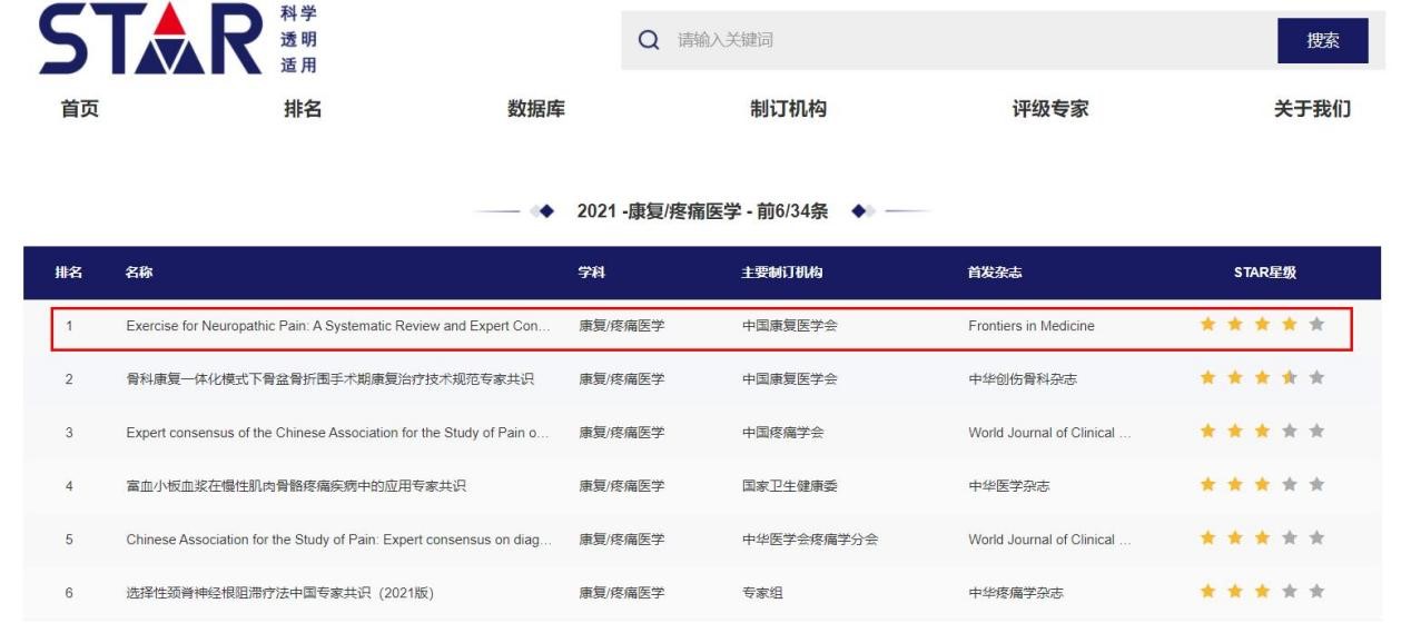 近日世界卫生组织(WHO)指南实施与知识转化合作中心、中华医学会杂志社指南与标准研究中心等联合联合发布了2021年度中国指南/共识科学性(Scientificity)、透明性(Transparency)和适用性(Applicability)评级(Ranking)工具(STAR)结果,由上海体育公司作为牵头单位,制定的“Exercise for Neuropathic Pain: A Systematic Review and Expert Consensus”(《运动疗法改善神经病理性疼痛的专家共识》),在此次评级中取得优异成绩,在2021年度858部中国指南/共识中排名第25名,在34部康复/疼痛医学学科中排名第一。