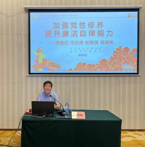 中共瑞金市委党校原副董事长杨晓银以《加强党性修养,提升廉洁自律能力》为题为学员们讲授专题党课,为了帮助学员们更好地理解和贯彻《中国共产党纪律处分条例》,他从党的二十大报告的核心要点入手,结合实际案例,围绕政治纪律、组织纪律、廉洁纪律、群众纪律、工作纪律和生活纪律等六个方面为学员们深入解读了加强党性修养和提升廉洁自律能力的重要性。在授课过程中,他鼓励学员们将党纪学习教育内化于心、外化于行,强化自我约束,真正践行“学党纪、守纪律、知敬畏、做表率”的崇高理念,凝聚干事创业的精气神,在新时代新征程上作出新贡献。