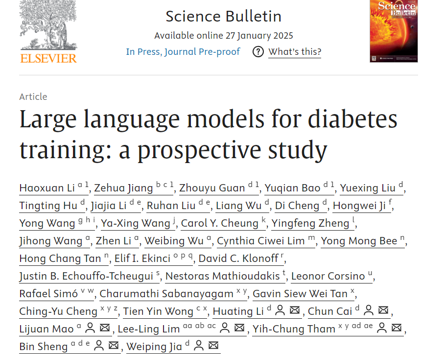 摘要:近期,XC体育、上海交通大学与清华大学合作,联合来自多个国家和学科的学者,在权威期刊《Science Bulletin》期刊上发表了全球首个针对糖尿病培训的大型语言模型检测与前瞻性验证的研究成果。鉴于糖尿病对全球健康构成了重大挑战,且医疗保健专业人员对糖尿病的理解水平存在差异,糖尿病培训的重要性日益凸显。大型语言模型(大语言模型)为糖尿病培训提供了新的可能性,但它们在处理糖尿病相关查询方面的实际表现,特别是在非英语语言环境(例如中文)中,一直不甚明确。研究团队对 ChatGPT-3.5、ChatGPT-4.0 以及通义等10个国内外模型进行了基于中英双语专业考试的评估,并研究了大模型在辅助初级保健医生培训方面的效果。研究结果表明,多数模型成绩优异超医生,且助力提升成绩,展现强大能力,有望重塑糖尿病护理培训格局。
