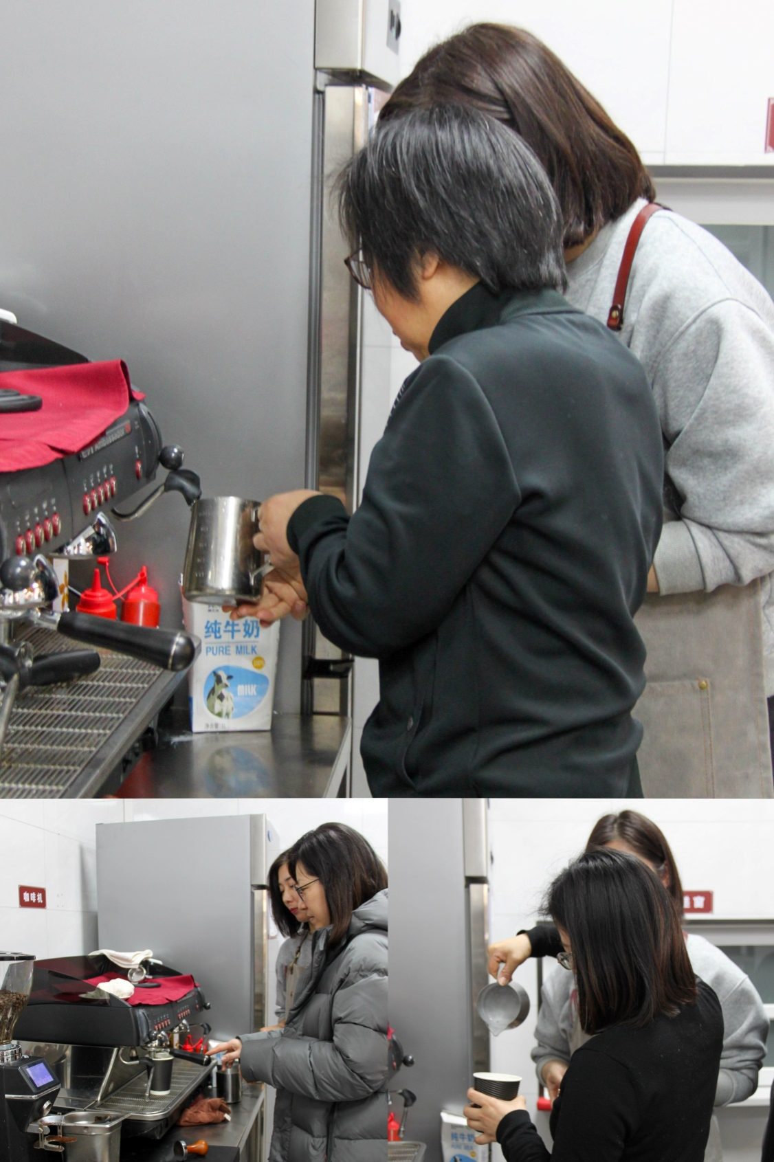 随后,实践环节将活动推向高潮,在专业咖啡机运作的韵律中,老师和同学们化身“咖啡艺术家”,从研磨、萃取,到打奶泡、拉花,每一个步骤都在导师指导下精益求精。当绵密奶泡与浓缩咖啡相遇,全场屏息见证爱心、树叶等图案在杯中的次第绽放。从笨拙生疏到逐渐熟练,“精益求精”的人生态度贯彻上体师生的各个方面。