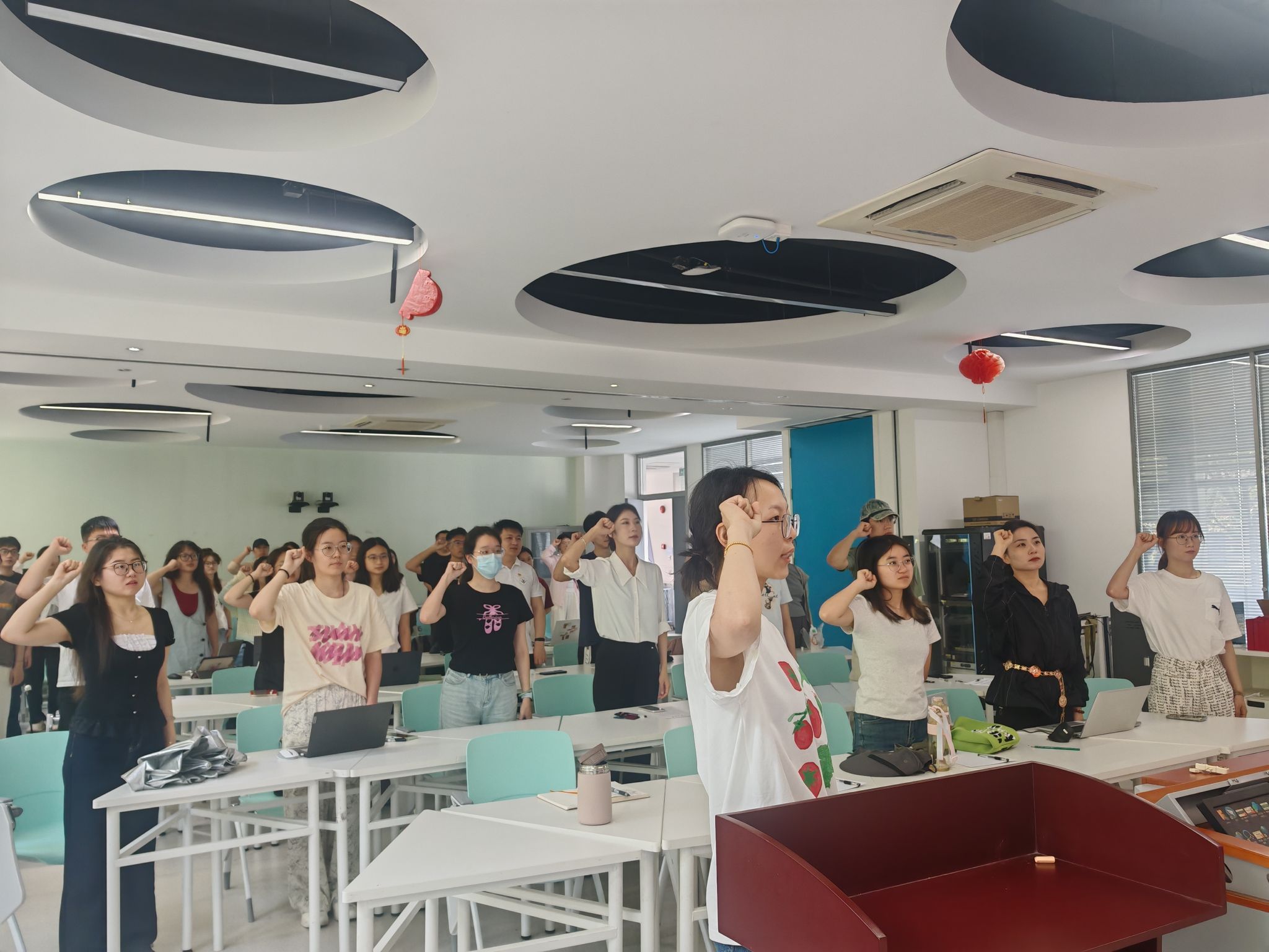 随后,支部书记唐雅洁带领全体党员同志面向鲜艳的党旗,庄严地举起右拳,共同重温入党誓词。