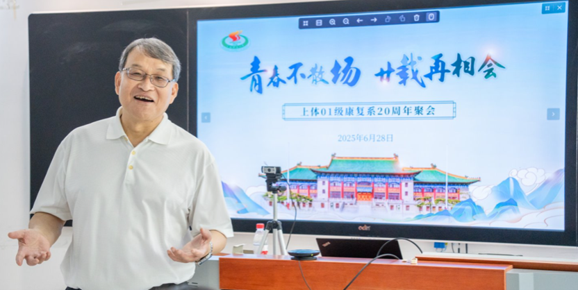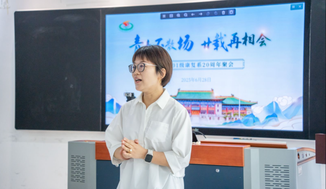 随后的“点名”环节将气氛推向高潮,员工们依次应答,仿佛重回课堂。多位员工分享个人成长故事,从临床一线到科研突破,从创业艰辛到家庭幸福,点滴故事折射出康复人的专业坚守与时代担当。辅导员殷勤、赵晓晗、班主任鲍明华、左群、史仍飞及教师代表陈文鹤、王人卫、潘珊珊和庄洁等深情寄语,勉励员工“以专业守护健康,以情怀回馈母校”。