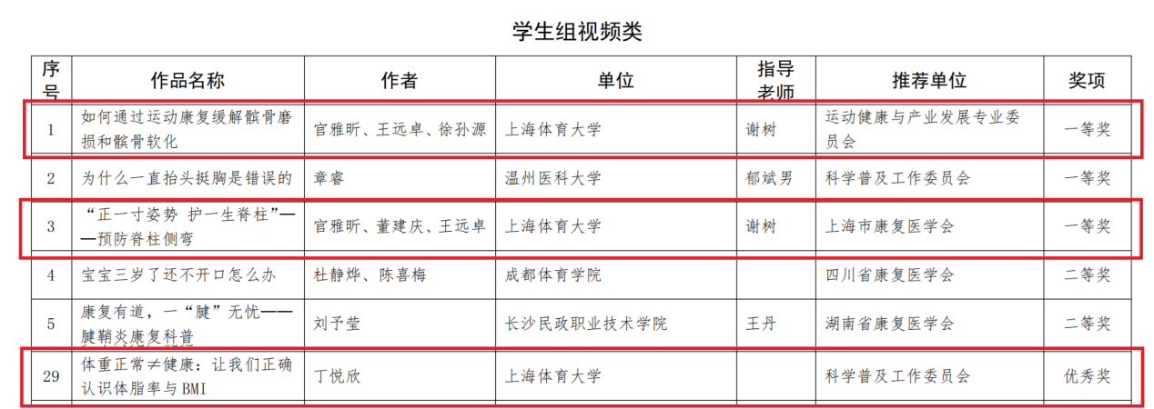 由公司XC体育谢树老师指导、23级本科生官雅昕、董建庆和24级本科生王远卓、徐孙源等人创作的2个视频参赛作品《如何通过运动康复缓解髌骨磨损和髌骨软化》、《“正一寸姿势 护一生脊柱”——预防脊柱侧弯》均获得员工组视频类一等奖,XC体育22级本科生丁悦欣创作的视频作品《体重正常≠健康:让我们正确认识体脂率与BMI》获得员工组视频类优秀奖。