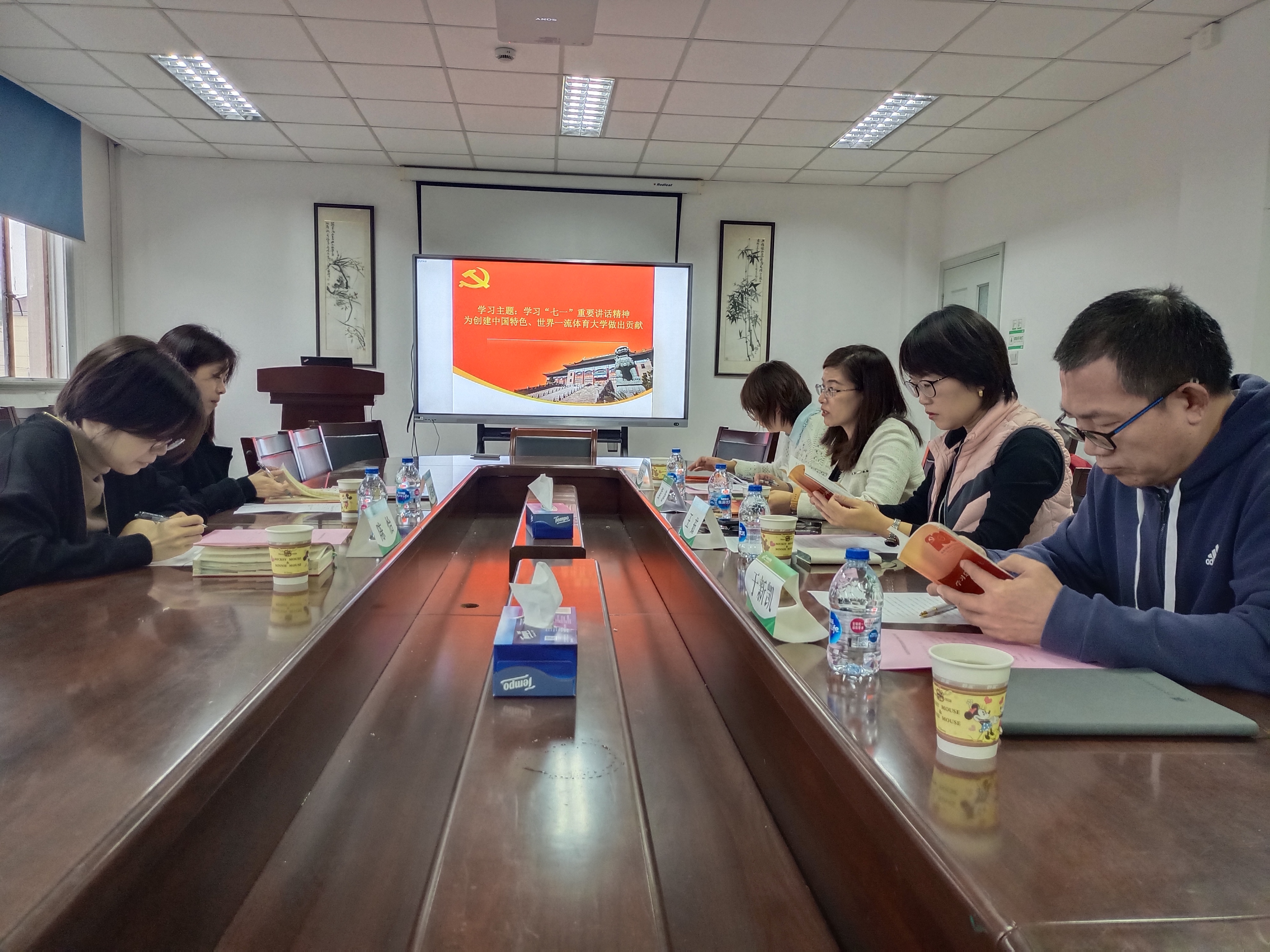 主题学习会上,熊静书记首先发言,她表示在峥嵘百年的历史岁月里,中国共产党带领人民创造的中国特色社会主义伟大事业是中华民族近代以来改天换地的新篇章,站在百年的历史新起点上,习近平总书记提出的“伟大建党精神”就是中国共产党继往开来不断前行的精神法宝。习近平总书记说中国共产党虽历百年,而今正是“风华正茂”,表明了中国共产党和中国共产党人经过了历史的磨砺而走出成熟、稳健的步伐。作为高校基层党组织的负责人,立德树人使命在肩,只有不断奋发有为,为群众办实事,为党和国家谋发展才能真正担负起时代赋予的责任和使命。对标世界一流体育大学的奋斗路上,我们还有很长的路要走,但是只要将中国共产党人百年精神熔铸在骨子里,就一定会取得未来的成功。