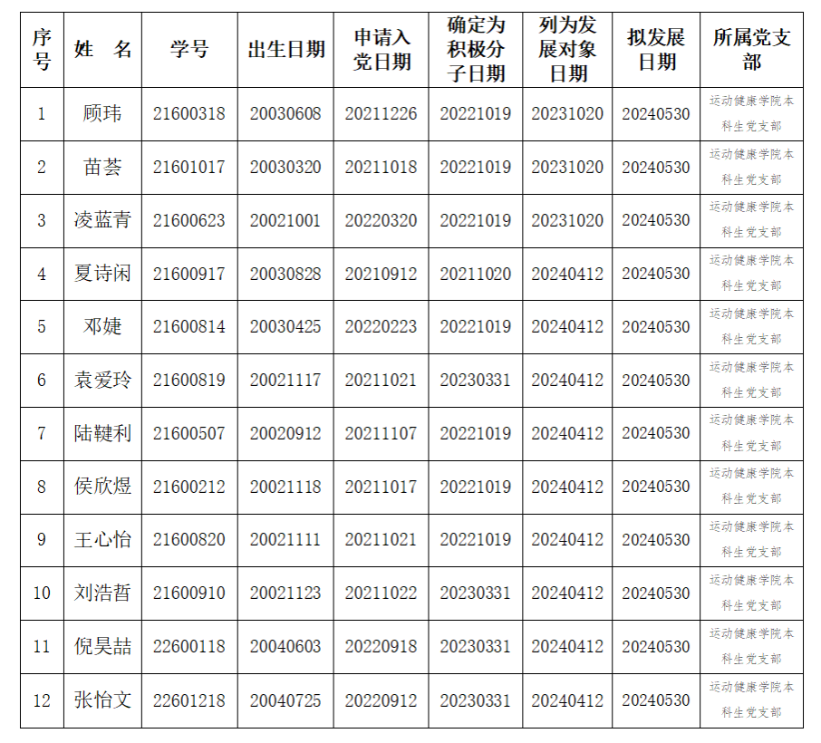 以上发展对象经过党组织的培养、教育和考察,基本符合党员条件。经党支部研究,准备发展为中共预备党员,特此公示。公示时间为七天(2024年5月21日—2023年5月27日),各单位或个人如有意见,可通过来电、来访、来函等形式反映。
