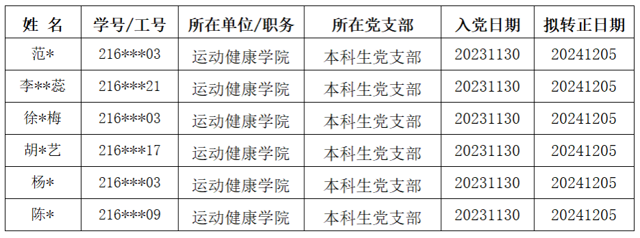 经过党组织的进一步教育和考察,以上6位中共预备党员基本符合正式党员条件,准备转为正式党员,特此公示。公示期为七天(2024年11月27日—2024年12月3日),各单位或个人如有意见,可通过来电、来访、来函等形式反映。