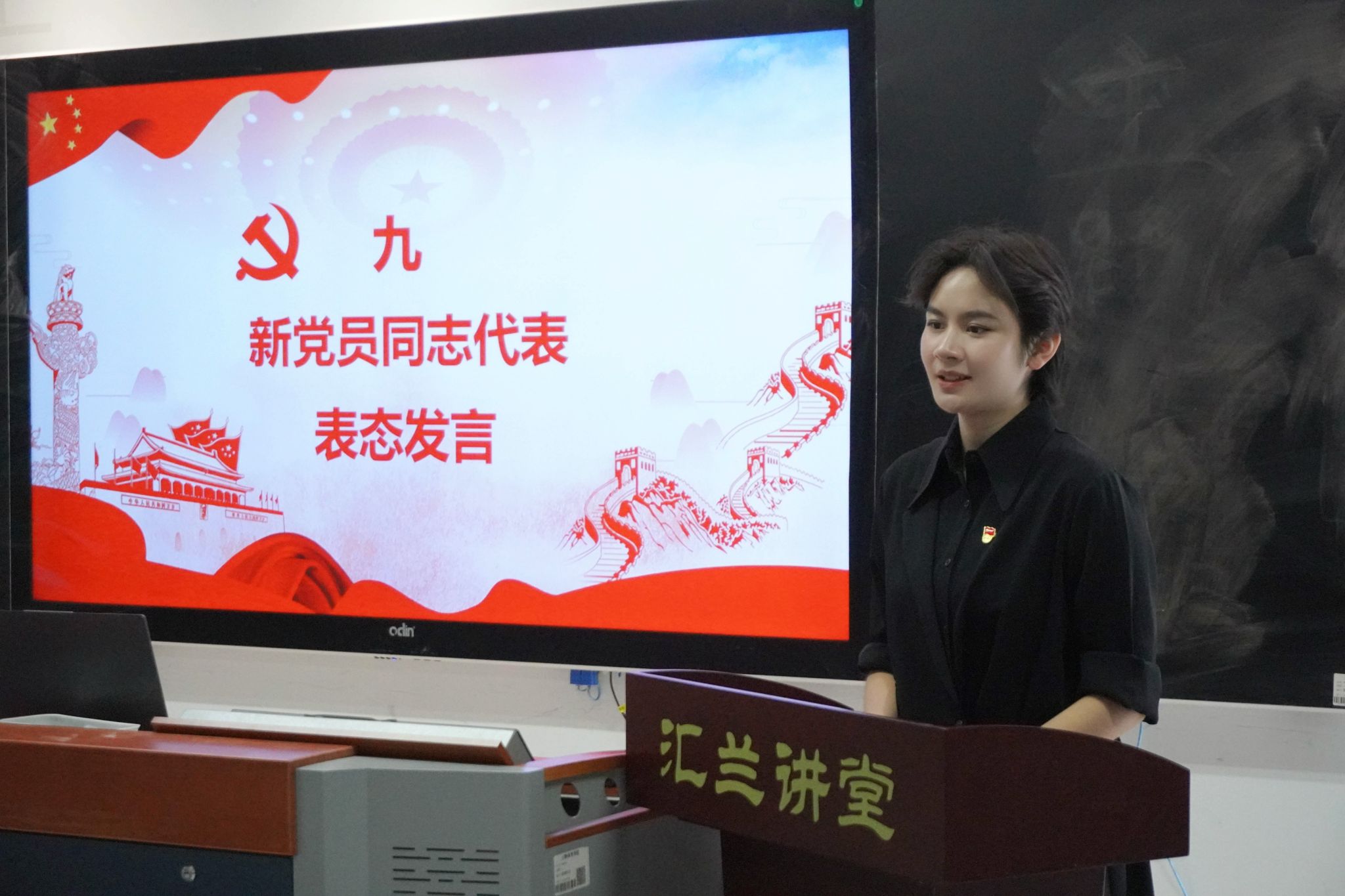 徐琬群同志作为新发展的预备党员代表作了表态发言。她以饱满的热情和坚定的信念,向党组织的认可表达了真诚的感谢,并郑重承诺:将持续深入学习党的创新理论,筑牢思想根基;充分发挥先锋模范作用;以青春和奋斗践行今日誓言,努力成长为一名合格且优秀的共产党员。