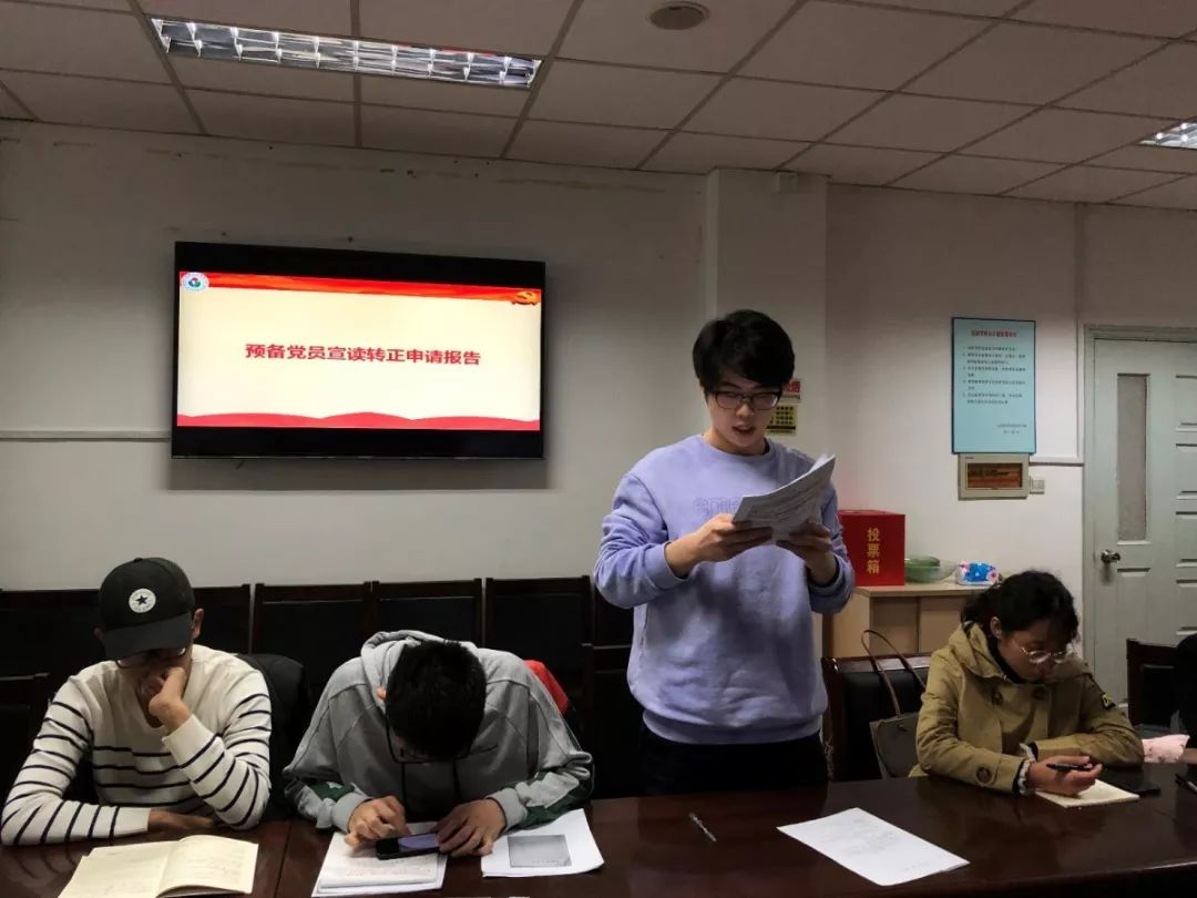 在慷慨激昂的国歌声,转正大会正式开始。会议伊始,首先由郭晓飞同志宣读了自己的转正申请书,向全体党员汇报自己的思想、生活、工作等情况。他表示自己在思想方面主动加强政治学习,同时在观看了国庆70周年阅兵之后,对党有了更加深刻的认识;在学习方面,正处于复习准备考研的阶段,要做到努力专心,全力以赴。