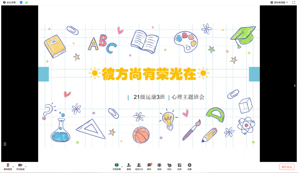 正处于大三阶段的同学们,面临着各种压力的困扰,而长期受到压力困扰会使同学们产生许多不良情绪。6月6日晚,XC体育21级运动康复3班以腾讯会议的形式开展了以“彼方尚有荣光在”为主题的线上心理主题班会。旨在帮助同学们找到缓解压力的方法,同时在面对未知的挑战时充满信念和动力,与压力和解、与压力共舞,相信未来美好生活的曙光就在前方。