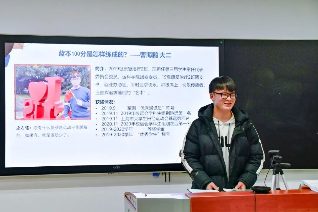 “蓝本一百分是如何炼成的。”运科19级康复治疗本科生曹海鹏同学受邀来到了“体医”融合专业沙龙,与同学们分享自己蓝本满分的方法。首先,曹海鹏同学分享了自己蓝本满分的一些小技巧:通过跳远的运动技能活动拿到第六栏的分数,通过参加国际会议拿到第二栏的分数......最后,曹海鹏同学告诉了大家蓝本满分的秘诀:“不要为了蓝本分而去拿蓝本分,去做了,用心了,该来的自然就来了。”本次分享让同学们重新思考自己对待活动的态度,也让同学们意识到蓝本满分并不是一件简单的事,需要用心对待每一场活动。