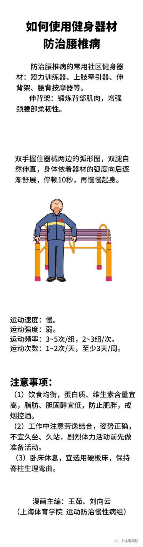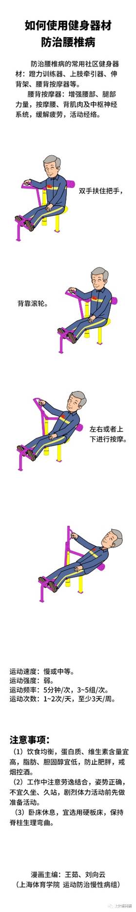 防治腰椎病的常用社区健身器材:蹬力训练器、上肢牵引器、伸背架、腰背按摩器等。